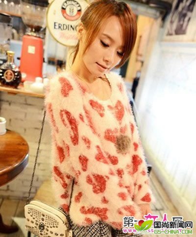 毛茸茸的桃心上衣,配上格子短裙,可爱感倍增,如此萌动的女生绝对会让你的男朋友移不开眼哦,再背上个性的铆钉款包包,让这份美感不会过于甜腻,很是迷人哦。
